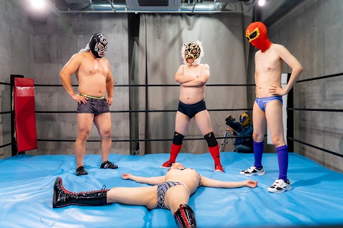 ドでいたぶりながらのエロ攻撃。ゴングがなるが、男達はさらに攻撃が続く