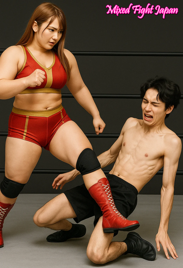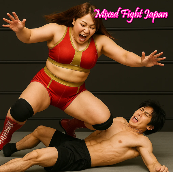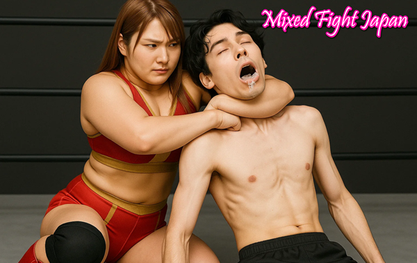 リングに倒れこんだ光の上に、妃華がゆっくりと跨る。脚が絡みつくように彼の胴を挟み、手首をがっちりと押さえ込む。彼女の長い髪がふわりと垂れ、まるで捕食者のように、微笑みながら見下ろしていた。