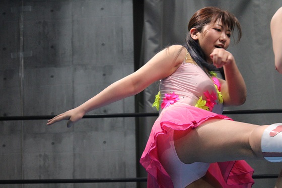 さらに、コーナーへ投げ飛ばし、そこへヒップアタック。